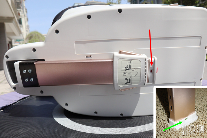不过呢,等到小朋友们长大以后,会切换到使用儿童安全带来保护他们,这个五点式安全带就基本上没用了。很多产品有很复杂的调节安全带高度和拆除安全带的方法,而qborn的座椅采取的对策是让用户在不使用它的时候,把它们全部收起来,下图里红色箭头位置是一个可以掀开的带卡扣的活门,安全带扣都收纳在活门下面。