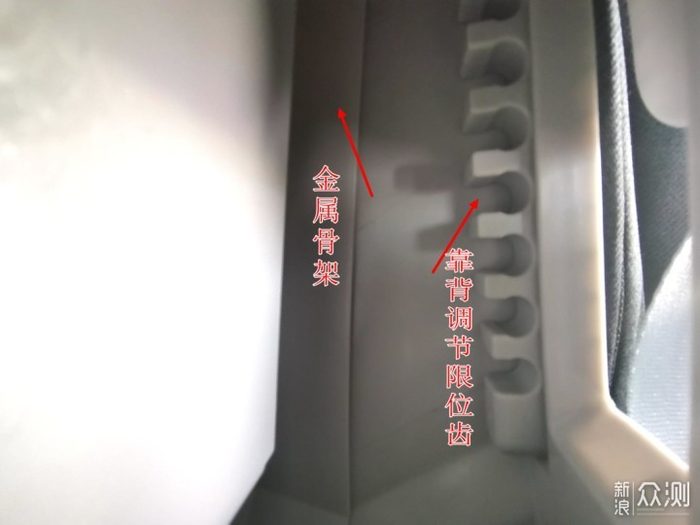 而翻开阻燃的座椅垫料,把头伸进去(相机镜头),我们还能看到这款座椅圆乎乎的外观下面,是隐藏着左右两侧金属骨架提供内部支撑的(同色,图片上看不出来,敲击和比对官方透视图确定的),而靠背调节齿也非常的粗大,提供较好的限位效果,而且面临冲击时,也能保护蛋壳里的小宝贝。