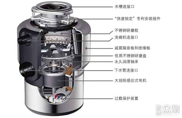 利用直流或交流电机驱动刀盘运动,利用离心力将倒入内部的垃圾快速研磨粉碎。没有利刃,安全、耐用、免维护。一般粉碎后的颗粒直径小于4毫米,所以不会发生堵塞排水管或下水道的问题。交流电机和直流电机各有特色,各大厂商针对不同电机的劣势也进行了改善,所以选购时不用过于纠结,一般原则是中低端以直流电机为主,高端的以交流电机为主。