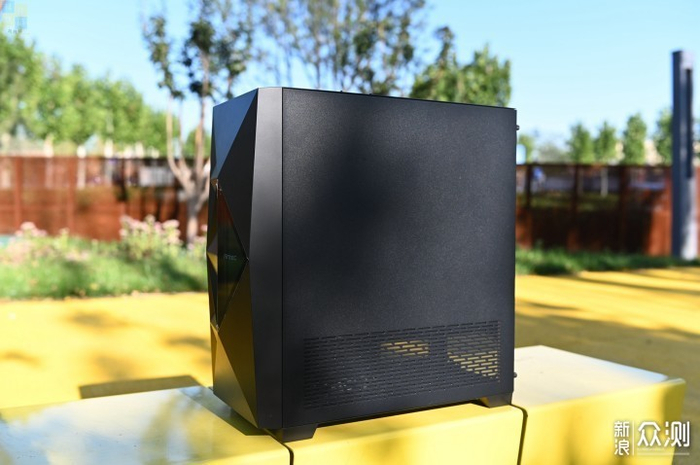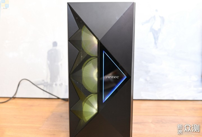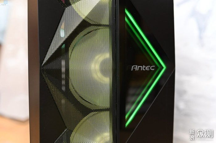 除了散热表现出色之外,星曜者DF800 Flux的设计也很有创意,它在前面板的设计上加入了非常密集的进风口,充分发挥了前面板3风扇位的散热优势,实际使用中,这种设计在平时清理灰尘时也很方便,直接用布轻轻擦一下就可以了。另外这块机箱前面板的几何造型也很有新意,特别是居中灯条这部分,还能映射出无穷的效果。