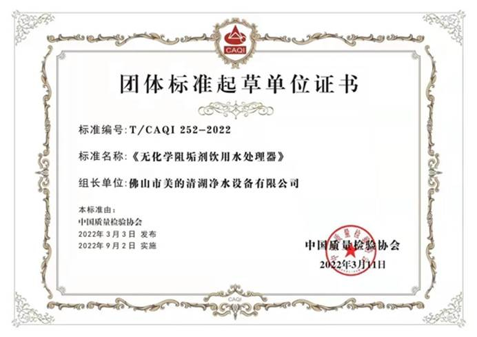 2022年3月3日,美的联合中国家用电器研究院、中国质量检验协会共同发布净水机行业团体标准——无化学阻垢剂饮用水处理器。作为中国健康饮水行业引领者,美的净水积极参与团体标准的制定,受到包括中国家用电器研究院等相关标准指导单位的一致肯定。
