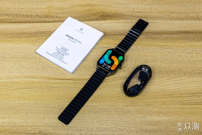 拆开包装,看到这款手表全部的组件,Haylou RS4 PLUS 智能手表1 只,USB磁吸充电线1根,多语言产品说明书1本(英、韩、德、意、日、葡、西、俄)七种语言,因为体验的是海外版,因此没有中文。