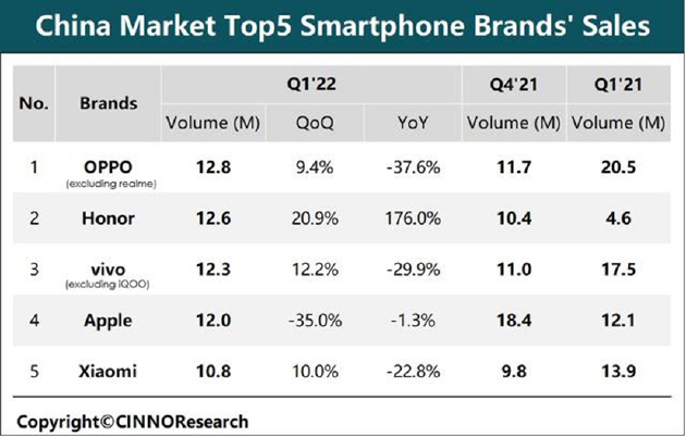 从国内市场来看,根据CINNO Research近日发布的最新数据显示,2022年第一季度,荣耀以1260万台的销量位居第二名,同比增长176.0%;小米则以1080万台的销量位居第五,同比下滑22.8%。