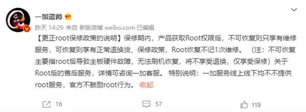 不过,近日一加修改了Root保修政策,对保修的范围进行了细化。
