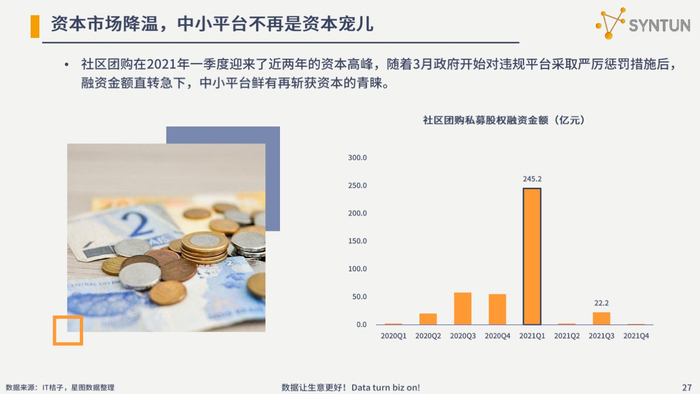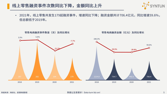 报告数据显示,2021年,我国线上零售总额为13.1万亿元,同比增长14.1%,高于市场整体增速。融资方面,2021年,累计发生融资事件179起,较2020年的194起融资事件,再次下降7.7%,但融资金额却从2020年的442.5亿元增长至2021年的706.4亿元,同比增长59.6%,虽然融资金额提升较多,但仍未恢复疫情前的水准。