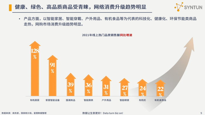 产品方面,智能、健康、绿色的产品备受青睐,网购市场消费升级趋势明显。