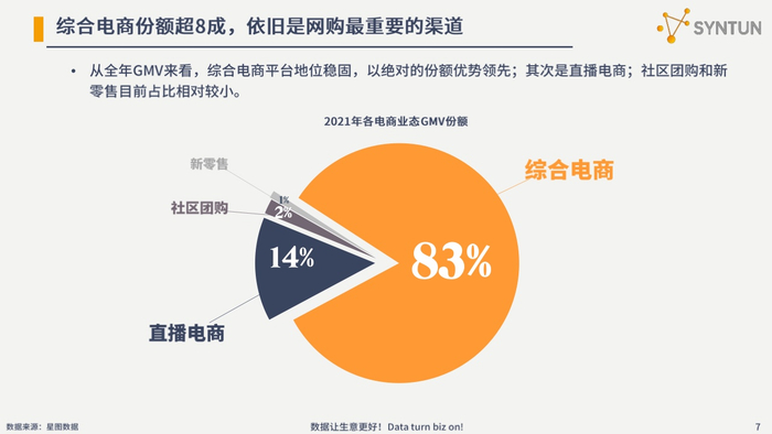 受政策收紧影响,2021年,电商行业呈高开低走之势,逐渐从野性回归理性。全年GMV数据显示,综合电商平台依然是当前电商行业的绝对龙头,份额优势明显,占比高达83%,其次是直播电商,占比14%、社区团购,占比2%和新零售,占比1%。
