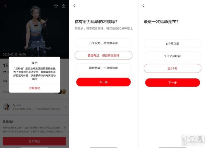 在进入课程前,会弹出一个对话框,简单两步测试一下运动值,也就是评估一下用户是不是经常运动。可以方便后面的课程强度设置。
