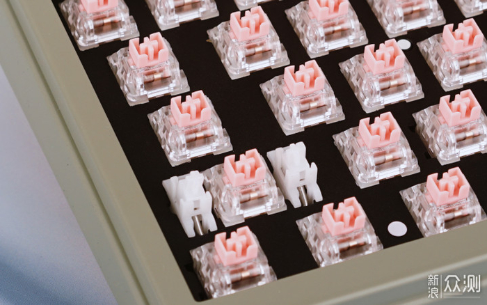 这次我所选配的是来自阿米洛的静电容V2樱花粉轴,它在在触发部件上则是采用了静电容原理,通过电容容值的变化来实现触发导通,不再使用传统机械轴使用的触电阻通断设计,在使用寿命、触发响应上都有着更好的表现。静电容樱花粉轴采用了线性手感方案,拥有直上直下的手感,总行程4mm、触发行程2mm、触发压力45gf,按压手感线性稳定,敲击起来顺滑轻盈,非常适合游戏玩家和高速输入者使用,同时杂音控制也不错。