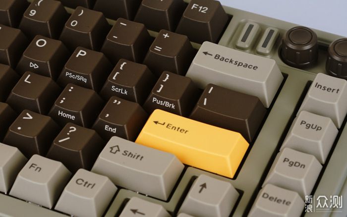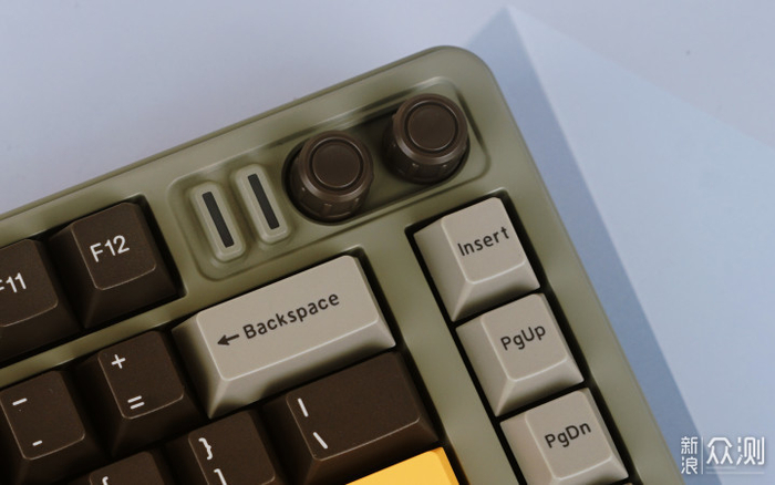 在键盘右上角,配备了两个功能旋钮,能方便用户实现快捷操作,提供灯光调整、音量控制等快捷操作。旋钮可以转动或按压实现控制,有着很高的便利性表现。
