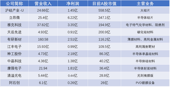 图表7:半导体材料上市公司2021年营收\净利润\最新市值