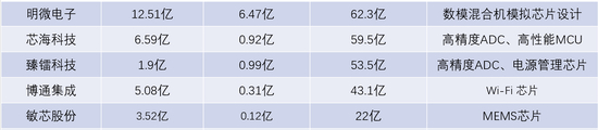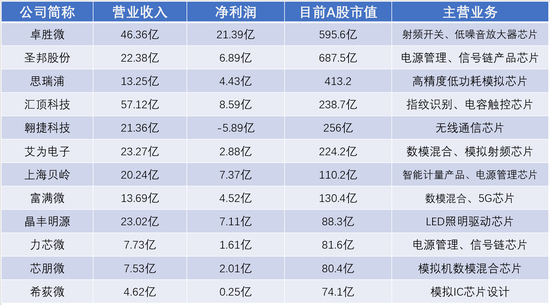 圣邦股份(300661.SZ)2021年营收22.38亿元同比增加87.07%,净利润6.99亿元同比增加142.21%,目前市值687.5亿;富满微(300671.SZ)近几年都保持了两位数的增长,2021年净利润为4.52亿元,同比大增388%。