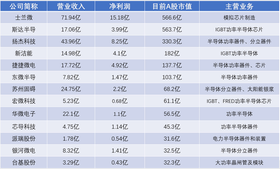 士兰微(600460.SH)是国内分立器件龙头,目前市值566亿,净利润为15.18亿增长21倍,2021年其产品持续在白电、通讯、工业、光伏、新能源汽车等高门槛市场取得突破,控股子公司士兰集昕8寸线基本保持满产,实现全年盈利;控股子公司士兰明芯LED芯片生产线实现满产、高产,实现全年盈利。