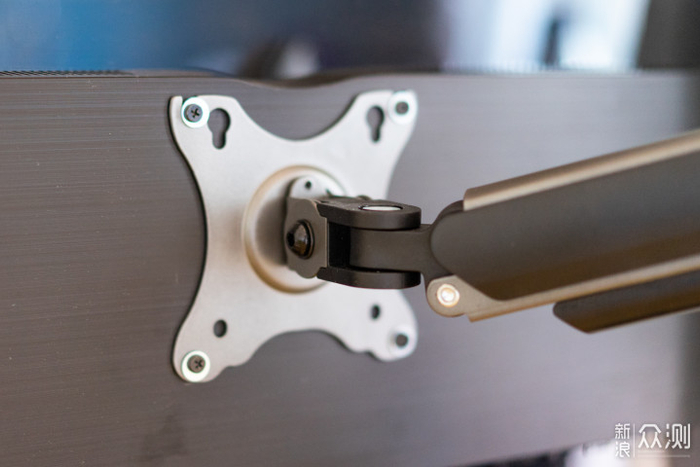 VESA支架与主体连接部分,是实现显示屏仰角和翻转的主要部件,看了商品介绍页的分解图,可以发现这部分的用料还是非常厚实的,使用下来,角度和翻转调节阻尼感适中。