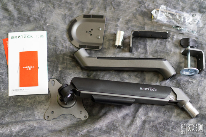 北弧E350的外包装直接是牛皮纸,就直接上全家福吧。主要分为显示器连接的上摆臂部分,下摆臂部分以及桌面安装三个部分组成。