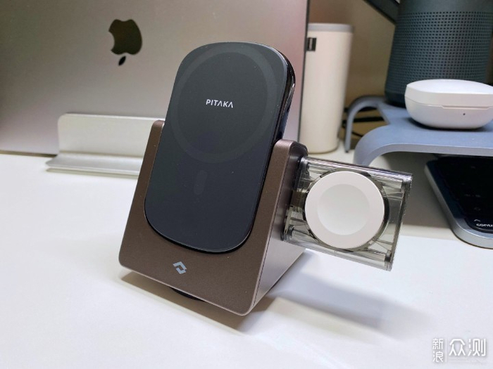 有一说一,满满当当放上去的感觉还真的很踏实,PITAKA MagEZ Slider让我的桌面变得无比干净整洁。相比之前桌面上手机一条线、蓝牙耳机一条线,Apple Watch一条充电线的大杂烩盛况,这个充电底座给我的桌面简直进行了全面性治愈。