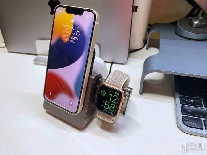 侧面的USB-C接口可以插入Apple Watch充电底座,实现手机、耳机、手表一个充电底座解决问题。
