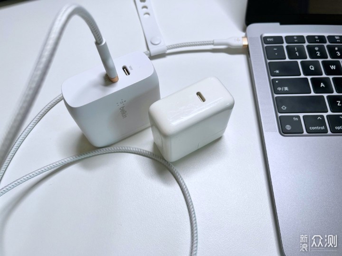 这么大体积,只有一个充电接口肯定是不能接受的,而且可以明显的看到这款充电头才用了半年不到就开始肉眼可见的发黄了。新入手的这款贝尔金63W双口快充,体积与苹果原装的30W相当,配置了两个USB-C接口。