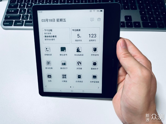 整个电子书大部分采用金属外壳,拿在手上非常的有质感。背部持握区域有做特殊纹路处理,放置阅读过程中不小心滑落。这款机器最薄的地方不超过4mm,持握手感非常的舒服。