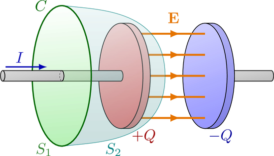 设我们考虑某绕过导线的闭合路径,如下图所示中的C所标识的圆形,以它为边界的曲面可以任意选择,图中选择了C本身围住的圆平面 ,以及跨过电容器左极板的曲面 。