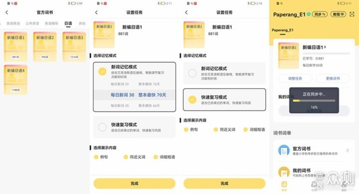 选择日语,新编日语1,可以看到词汇量有881,然后有两种模式,一一种是新词记忆模式,另外一种是快速复习模式。在新词记忆模式中,有不同的进度设计。在快速复习模式下,可以选择展示例句、同义词或者词组短语,强化记忆,选择好以后,就开始同步。APP会将选择好的词书,同步到电子单词卡E1中。数据同步的时候,可以在电子单词卡的屏幕中看到“数据同步中…“,在完成以后,会在屏幕中提示数据同步完成,并让用户单击红色的圆形按键确认。单词内容的时候,可以通过红色按钮切换到下一个单词。
