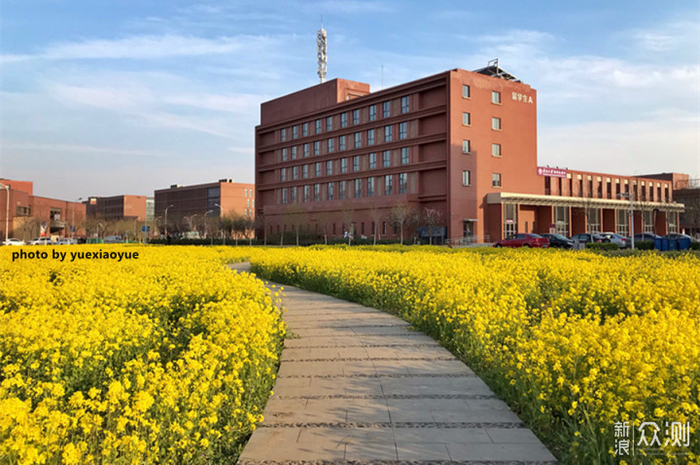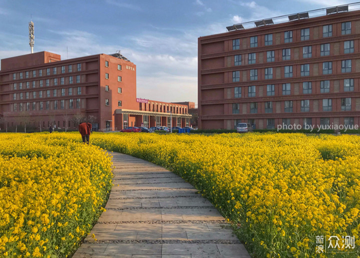 中规中矩的构图,远景有教学楼,近景大片油菜花,虽也有前后层次,但并不明显,怎么办?