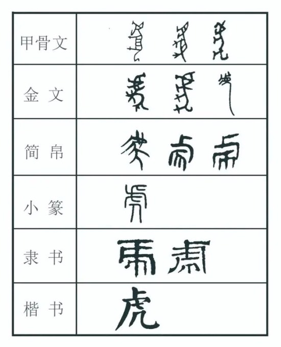 在甲骨文中,虎字形如一只大口尖牙、长身形的兽类。而虎的读音与猫属于同一类型,即模仿虎的嚎叫。