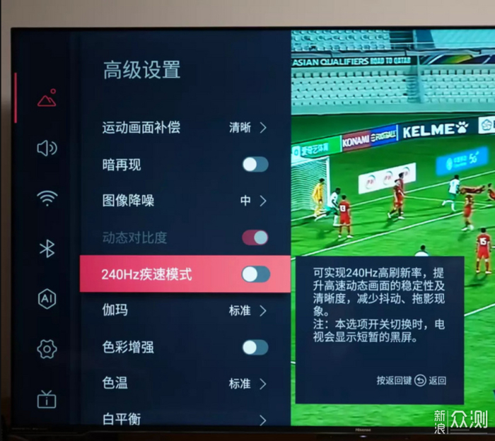 此外海信自带了120Hz高刷新+120Hz MEMC,通过海信自研的倍频刷新技术实现了240Hz超高刷,可以有效减少游戏、运动影像的拖尾、卡顿现象,使得画面更加顺滑流畅,对于喜欢观看竞技比赛和动作电影的朋友来说能够有着更好的效果呈现。