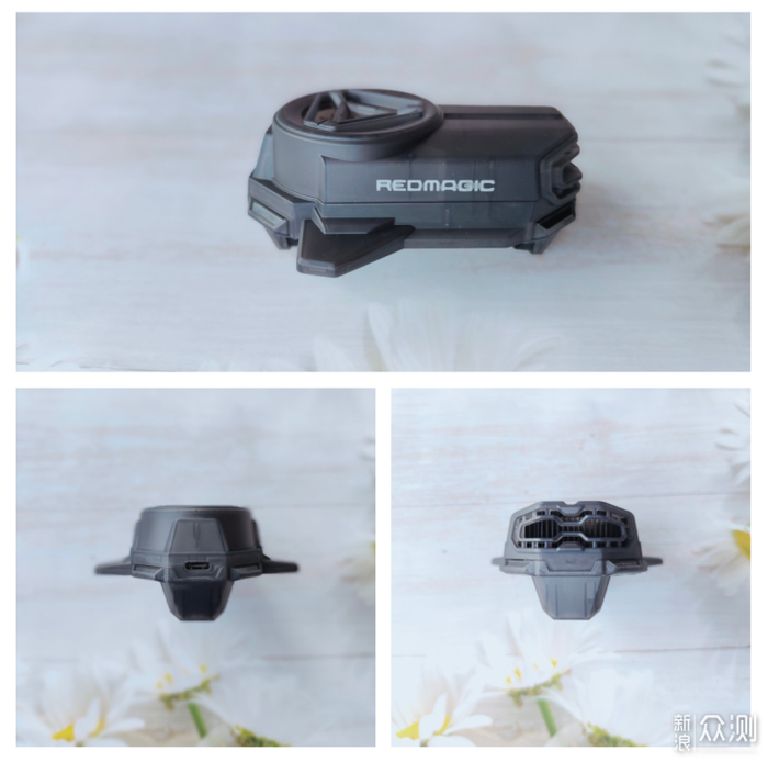 红魔仅在顶部有一个出风口,采用的是航空铝散热格栅,侧面并没有开孔,仅在底部有一个Type-C接口,用来连接电源。红魔的整体感觉更像是一个飞机的涡扇引擎,风道设计更集中,出风吹不着人脸或者双手,舒适性更好一些。同时搭配两个扁平的侧翼,横握状态下两只手更有地安放,握持的手感也更好一些。
