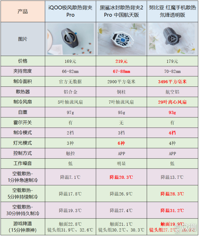 它们分别是前几天刚出的新品iQOO极风散热背夹Pro,黑鲨冰封散热背夹2 Pro 中国航天版,努比亚 红魔手机散热氘锋透明版。字多不看的朋友请直接跳到总结部分看对比图表和评价。