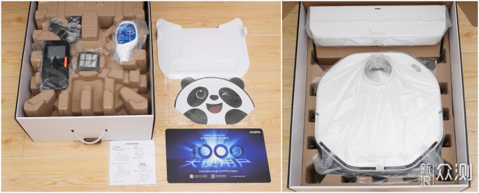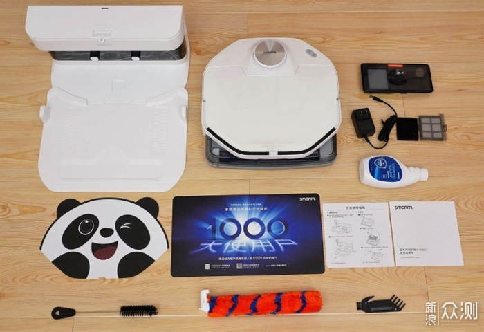全家福从左到右,从小到上,依次为充电座+自清洁托盘、机身、干扫模式专用水箱盖、电源适配器、备用洗地过滤海绵、备用干扫滤网组件、清洁剂、装饰贴纸、前1000名天使用户的宣传卡片,快速使用指南、说明书、清洁毛刷、纯软毛滚刷、毛发清理割刀。