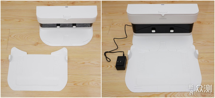 充电座和自清洁托盘合体和分开使用都可以。家里是地板的,必须得安装托盘,以防湿滚刷损坏地板。底座黑色区域是红外线传感器、另有两个银色的充电极片,新品时有层贴膜记得拿掉,否则机器无法回充。