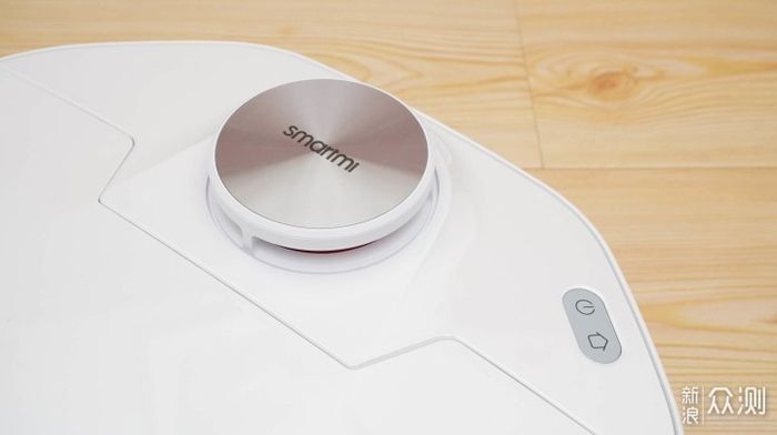 上方有带有“smartmi”标识的雷达罩,右侧是按键区:开关机键和回充键(具体功能后面细说)。