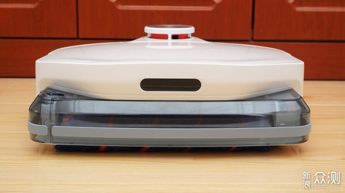 除了机身高度略厚(主要是因为内置了水箱)。前面横向、机身等宽的滚刷组件外,跟常见扫地机器人没啥区别。