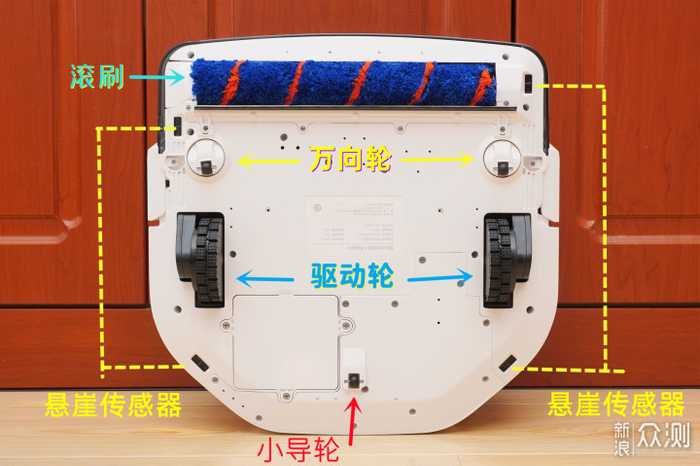 底部的结构跟常见扫地机器人有挺大区别。滚刷在最前端,有两个小万向轮,后面有一个小导轮,有4个悬崖传感器,相比现在常见的6个传感器的,略少。