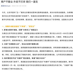 【TechWeb】5月1日消息,昨天,北京市宣布“五一”期间北京餐饮经营单位暂停堂食服务,转为外卖和自提服务。据美团发布的消息,为保障居民日常生活需求以及广大商户经营,我们在北京市相关政府部门的指导下,快速成立应急保障专项小组,北京相关业务人员取消休假,24小时轮岗值班,运用互联网平台数字化科技力量,在供给保障、配送安全、商户扶持等方面推出以下多项举措,全面助力北京市保供服务。