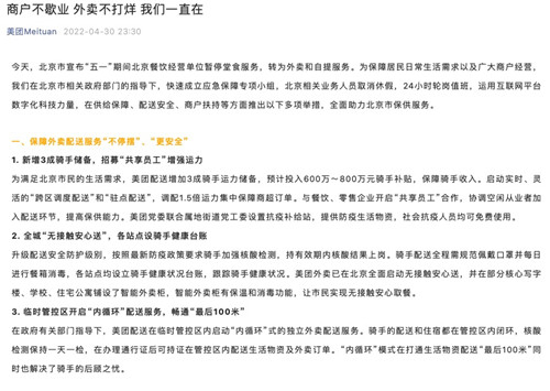 美团:保障外卖配送服务“不停摆”、“更安全”