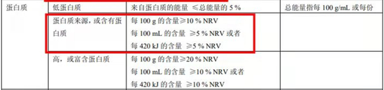 有一个重要的常识大家要记得,能在食品包装上标注“低糖、低脂、含有蛋白质”等字样,可不是企业随随便便就能标的。正规企业的产品要标注 “低糖、低脂、含有蛋白质”等字样,是需要符合《食品营养声称和营养成分功能声称准则》的。如下图所示,以蛋白质为例,包装上宣称“含有蛋白质”或者“蛋白质来源”都是有严格的标准的。