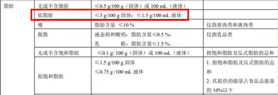 除了蛋白质的声称,我们再来看看脂肪和糖的营养声称,也是有明确的标准的。