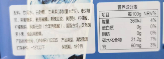 其实脂肪低热量低的冰品也很容易。看看下面这个雪泥,配料的主要成分是水和白砂糖,当然脂肪就很低——零脂肪零蛋白质。大家可以理解为加了一点增稠剂、调了味儿和颜色的糖水。所以把这两者放一起比,确实没啥必要。