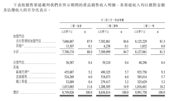 值得注意的是,基于百果园大规模地拓展加盟,加盟门店的收入是其总收入的大头。招股书中显示,2021年,百果园加盟门店收入占81.3%,区域代理占9.3%,直接销售占5.7%,线上渠道占3.2%,而自营门店仅占0.4%。