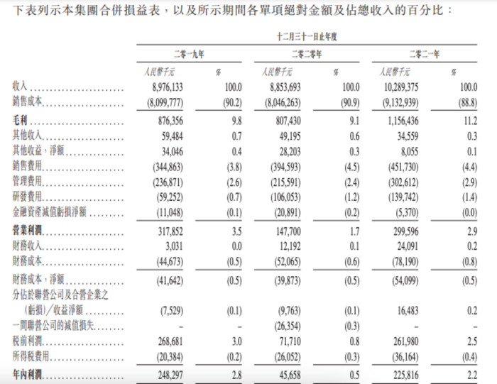 百果园营收主要来自于水果及其他产品销售、特许经营权使用费及特许经营收入、会员费收入以及其他收入。根据招股书,2019—2021年,百果园的收入分别为89.76亿元、88.53亿元、102.89亿元,同期毛利率尤为引人注目:分别为9.8%、9.1%及11.2%,整体并不高;净利润分别为2.48亿元、0.46亿元、2.26亿元。