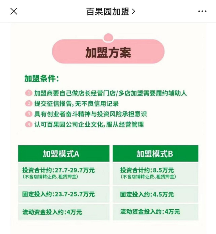 按照百果园加盟微信公众号给出的AB两种加盟方案,开设一个加盟店的总投资额分别是27.7–29.7万元、8.5万元,其中B方案少去了6.2万元的招牌设备费、3万元信息设备费以及10-12万元的装修预估款。