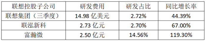 不仅是联想集团,联想控股其他子公司,如联泓新科、富瀚微等,研发投入占比均保持高位。2021年研发投入同比增长分别超过了60%、100%。