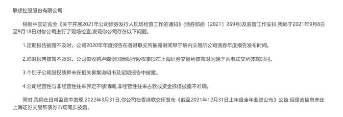 同时,北京证监局在日常监管中还发现,联想控股于2022年3月31日在香港联交所发布2021年年度报告,该信息同样未在上海证券交易所债券市场同步披露。