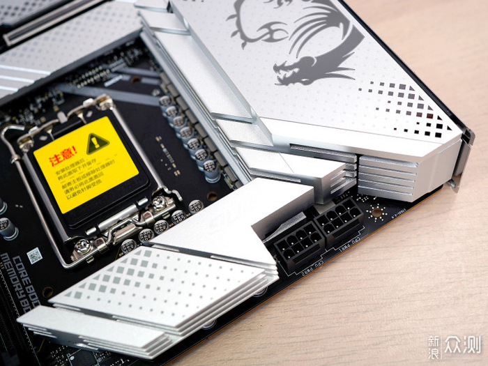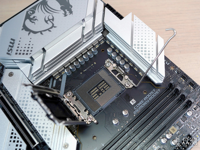 供电的散热块很大,并且侧面有开槽设计,以增大换热面积。另外I/O上方的微星龙盾图案也是有RGB灯效的,颜值很高; LGA1700 CPU插座,支持第12代Core,与LGA 115X相比,由正方形边变为了长方形,打开的方向也完全相反,另外就是安装孔距从75mm*75mm变更为78mm*78mm。