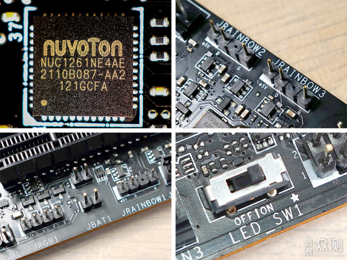 在RGB方面:Nuvoto的NUC126NE4AE,ARM 架构的 32 位单片机,用于控制ARGB 灯效;主板上方和下方各有一个3pin 5V ARGB和一个4pin 12V RGB插针。另外还有一个RGB灯效的物理开关。