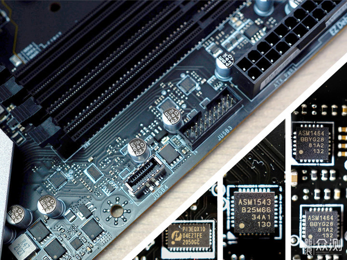 24pin供电插口下方有前置的一个USB 3.2 Gen1 Type-A(5Gbps)和USB 3.2 Gen 2X2 Type-C(20Gbps)扩展口。两颗ASM1464芯片是USB 3.2 Gen1的IC芯片,负责中继和加强供电;ASM1543芯片实现的 Type-C 口正反盲插,P13EQX10是桥接芯片。