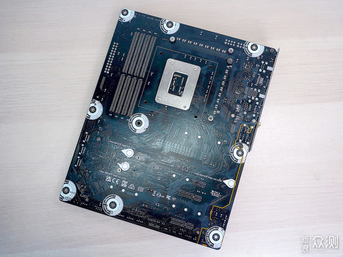 PCIE 5.0和DDR5基本都使用了SMT技术,在PCB背面是看不到穿板焊点的。但由于是DDR4版本还是能看到内存以及芯片组提供PCIE的穿板焊点。另外在每个螺丝孔周围多了一圈白漆,起到保护主板防止刮伤的作用。