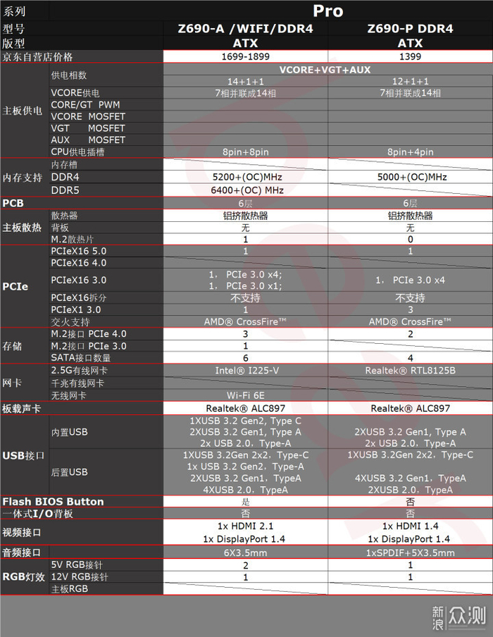 Z690-P 只有DDR4版本,供电、M.2接口数量等方面都是弱于Z690-A ,优点就是最便宜,Z690的钙中钙价格确实也是非常诱人的。